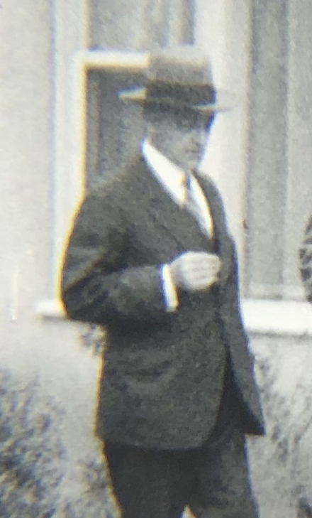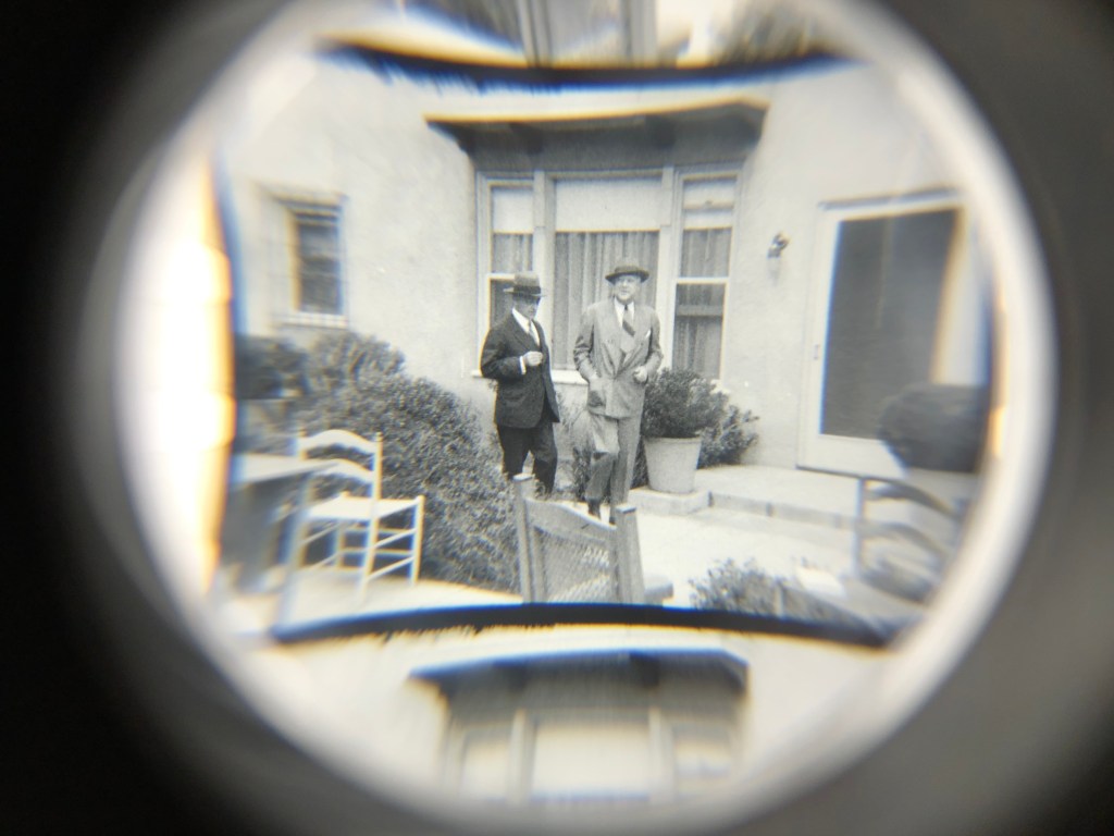 Next, two men, one in a dark suit and potentially F. Scott Fitzgerald, walk by the exterior of the Ambassador bungalows. The other man is unknown. There are many photographs to be found of F. Scott holding his cigarette in this same particular manner. But it just isn’t definitive enough to say.