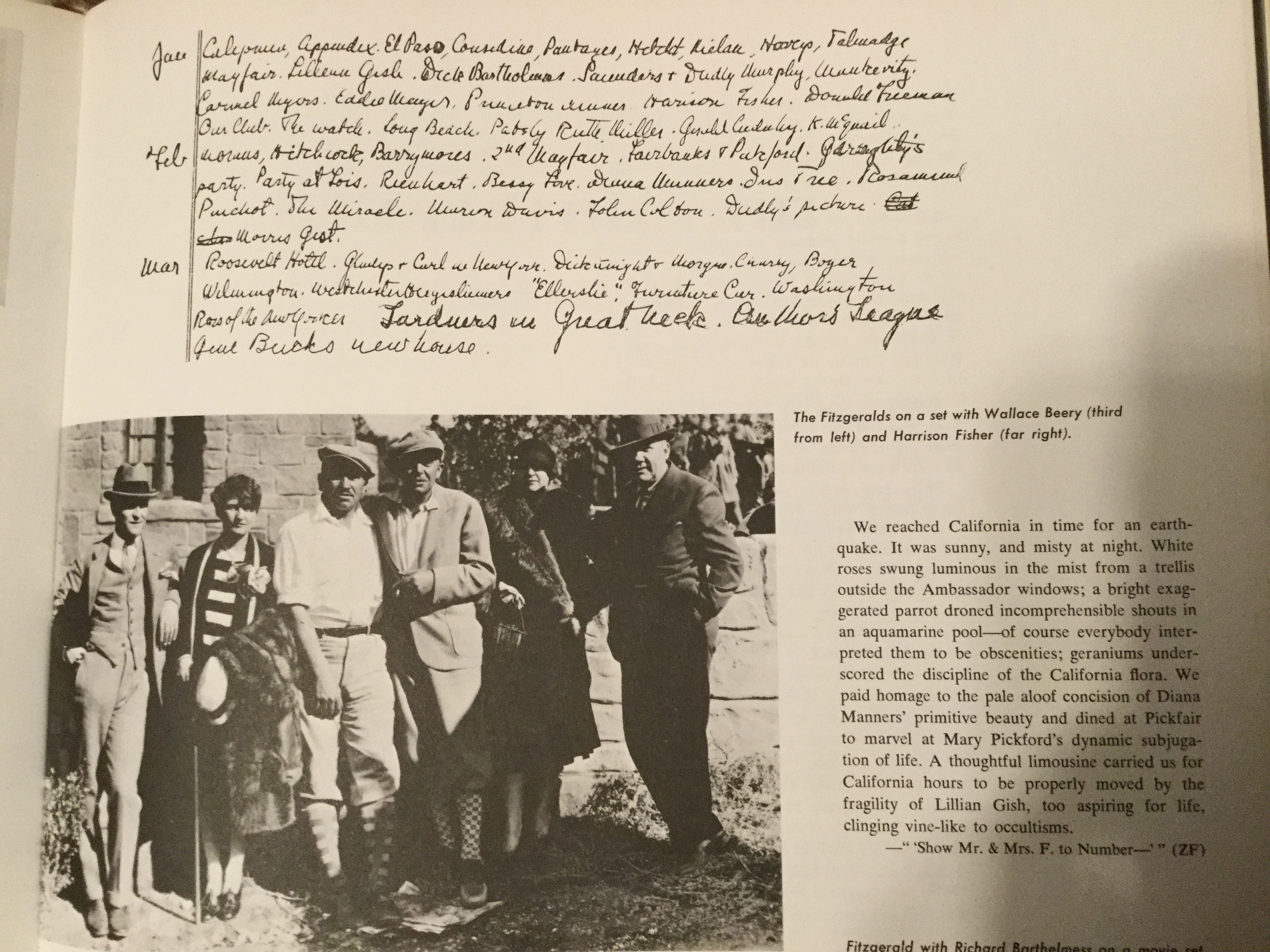 Alaina Doten, curator of the Fitzgerald Museum, found photos taken on the same 1927 trip to Los Angeles with Zelda in the outfit from the end of the film (see below). F. Scott is on the far left, and seems to be wearing a lighter suit, so that may not have been him in the earlier scene. Their neighbors at the Ambassador at the time were John Barrymore, Carmel Myers, and Carl Van Vechten and they have been recorded as socializing with Lillian Gish and Richard Barthelmess, so perhaps some of these folks are indeed the people photographed in the film.
