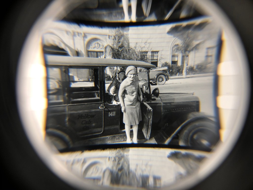 Two women, believed to be actresses Lois Moran and Carmel Myers, playfully commandeer a parked taxicab as the driver looks on. The women hop in the cab, honk the horn and hop out again as cars whiz by on busy Wilshire Boulevard in downtown Los Angeles (the historic Ambassador Hotel is seen behind them across the street).