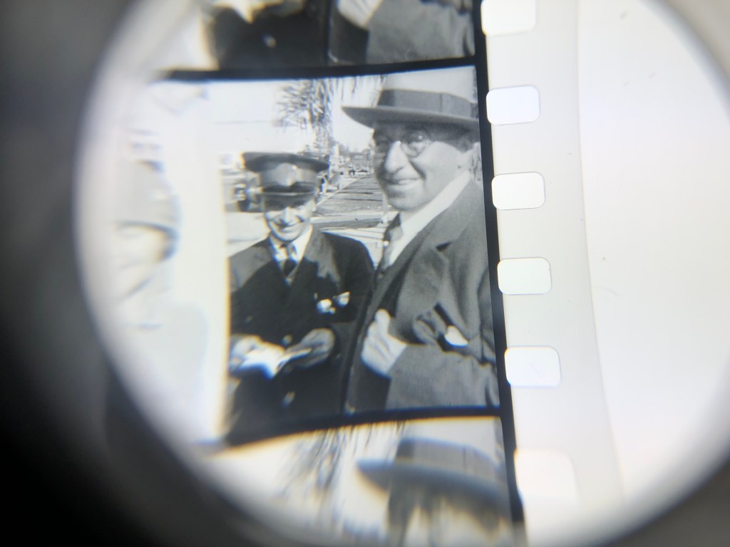 The nitrate film was immediately driven to Colorlab in Rockville, Maryland, where they have proper equipment and storage. We asked them to send us a quick scan of the film so we could get an idea of the content. Upon their request, we gave Colorlab permission to post the video on their Instagram account to see if anyone could help identify people and places. This post garnered attention from journalist Ethan McLeod, whose research was integral in potentially identifying a few people in the film up front: Lois Moran, Carmel Myers, Zelda Fitzgerald, F. Scott Fitzgerald and Louis B. Mayer (you can read Ethan’s article here). Based on this research, the palm trees, and a sign in one of the shots that read “The Ambassador Hotel”, we felt fairly certain that this film is a genuine document of the Fitzgerald’s first trip to Los Angeles in 1927.