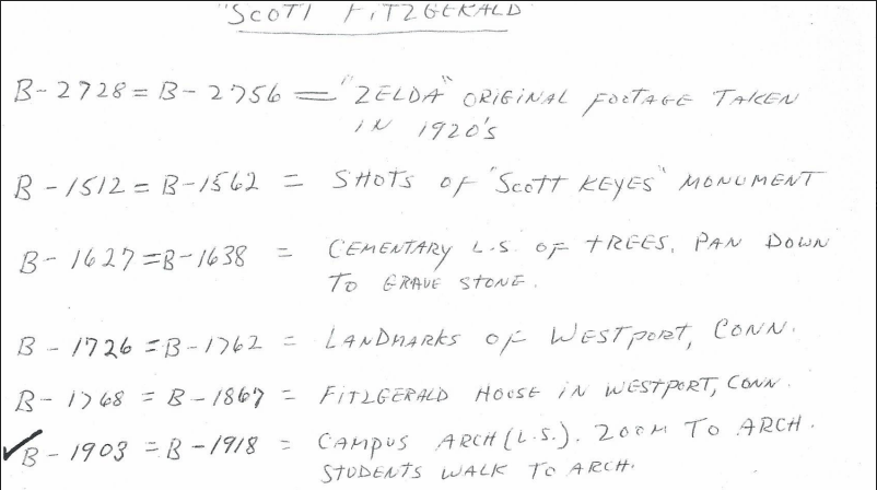 There were two, small reels in the can that Matt found: one was an original 35mm silent nitrate negative, and the other an acetate 35mm copy of the nitrate negative. The nitrate negative had a 1926 edge code, a code put on a film reel by the manufacturer listing what year the film stock was made. The only information on the container, other than the word “NITRATE”, was a handwritten note that said, “Return to Mrs. Lanahan Scott Fitzgerald”. The small can was stored inside of a much larger film can with several 16mm film reels, a smaller film format which was typically used by television stations. All of these 16mm films were original production elements from Marked for Glory, a 1963 television documentary special about literary giant F. Scott Fitzgerald that WJZ-TV made and broadcast. Since the nitrate negative was stored with these 16mm films, we assumed that this nitrate film was used either in the research or the production of WJZ’s Marked for Glory–and based on the label, as stock footage. Based on the can label of “Return to Mrs. Lanahan”, MARMIA surmised that the film was borrowed from the Fitzgerald estate, as Zelda and F. Scott Fitzgerald’s daughter Scottie’s married surname was Lanahan during 1963. But it seems the film never made its way back to Scottie, who passed away in 1986. We also found a handwritten list of shots with the production elements, which at the top says “‘Zelda’ original footage taken in 1920s”. This led us to hope for rare footage of Zelda Fitzgerald, a literary giant herself and celebrity who still personifies the term “flapper” in American minds and hearts.