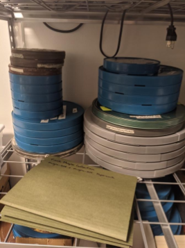 After the content assessment and repair, I would assign a unique ID number to each film, following the naming convention of “collection name-###”, in this case it was mugno-001, mugno-002, and so on. With this information, I was on to the final step, rehousing the materials. Many of these film reels came 2 or 3 to a canister, which were sealed metal enclosures with old tape. Film should be able to “breath” and kept separate from other reels in their own housing to prevent any acidic off-gassing which can result in film deterioration. Luckily, MARMIA has access to archival grade film canisters and so our collection went from looking like this:
