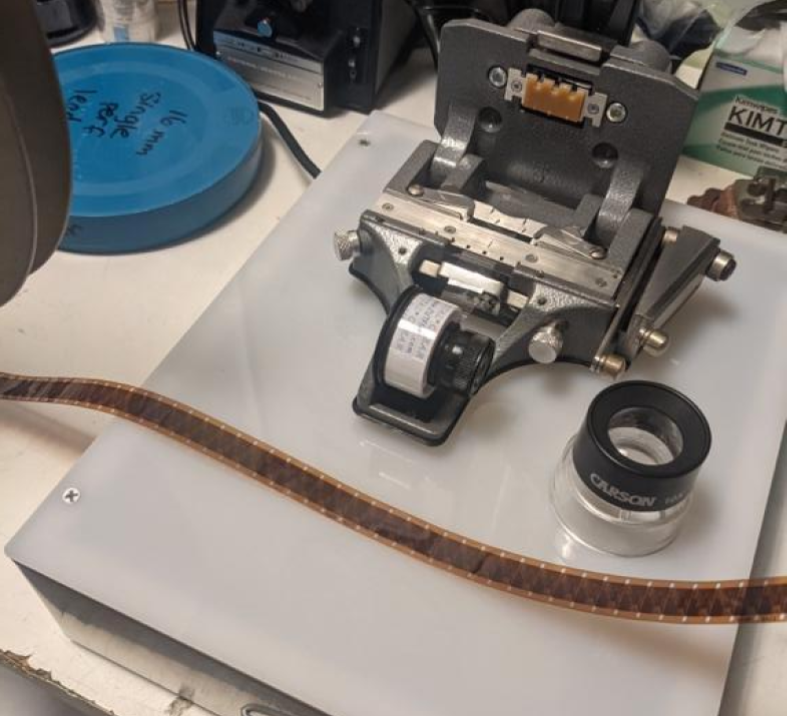 One of the most notable discoveries about the collection is that it primarily consists of film negatives and outtakes (both silent), which were used in the making of the final films, yet no final versions of Mugno’s films seem to be present. That being said, I was able to obtain a detailed sense of what was on the reels by looking at them through a film loupe (magnifying glass) utilizing a light box, as shown below.