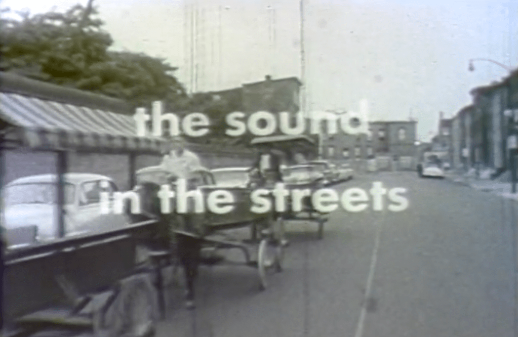 - The Sound In the Street (with narration), 1961-10-12, WJZ-UNKN-198-003, Box: UNKN-198. WJZ-TV Collection, WJZ. Mid-Atlantic Regional Moving Image Archive.